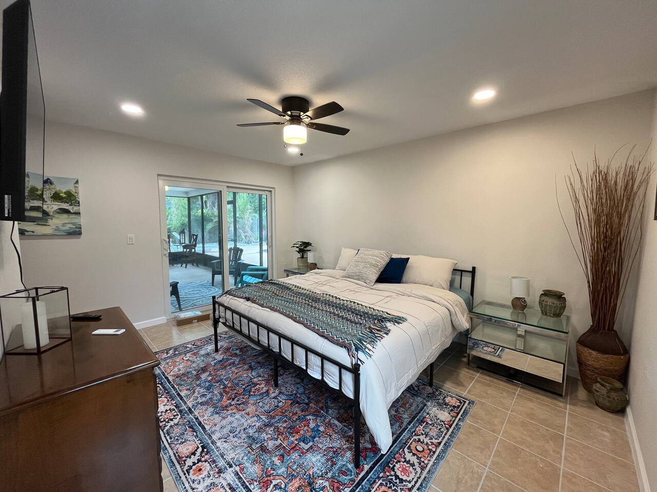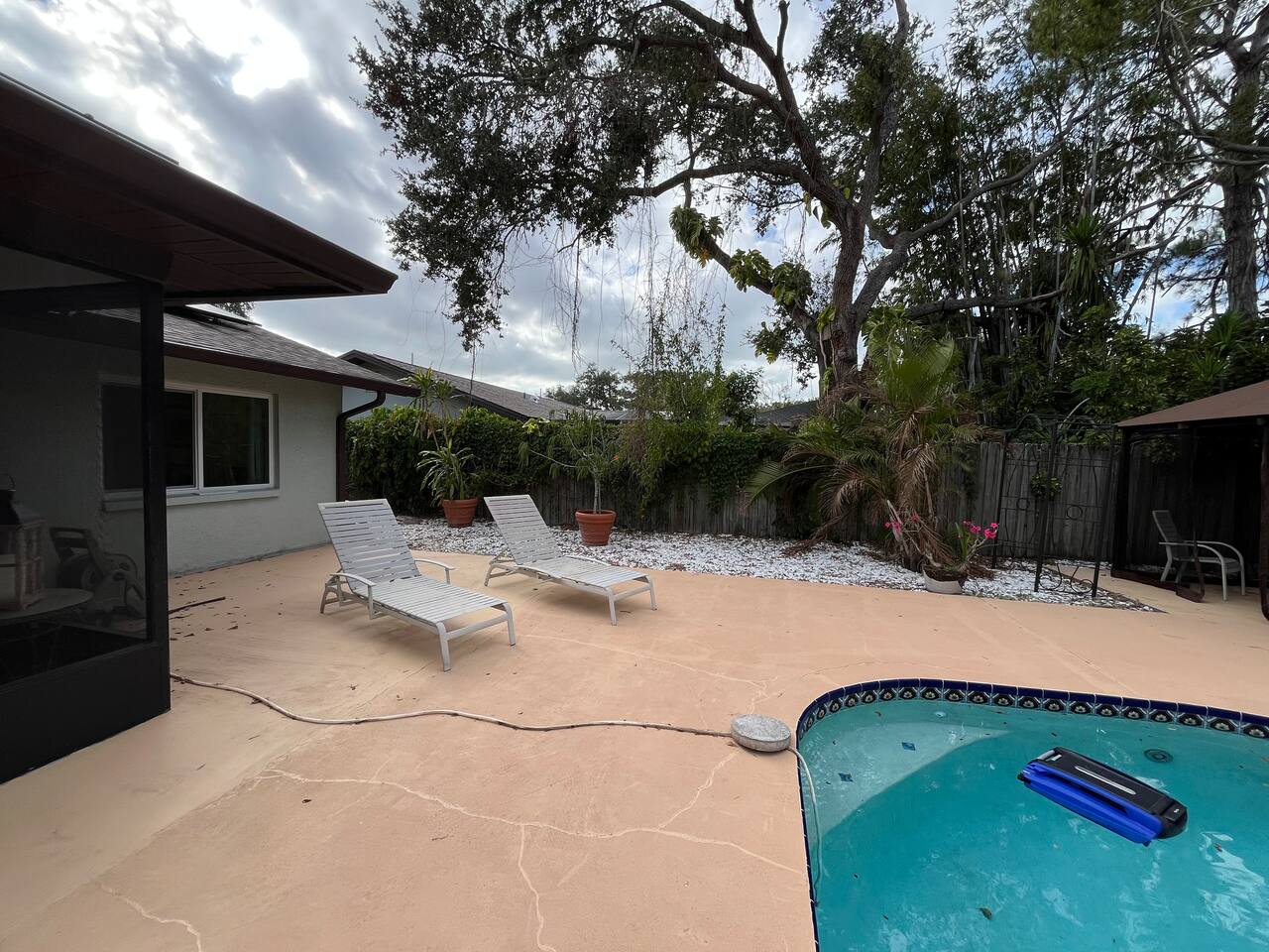 Relax in this stylish Mediterranean-inspired 2BR/2BA Clearwater retreat. Enjoy a private pool, gazebo, and cozy propane fire pit—perfect for evenings under the stars. The primary suite offers comfort and privacy, while the guest room features two full beds plus a dedicated workspace. Just 15–20 minutes from Clearwater Beach, this home blends coastal access with peaceful comfort.