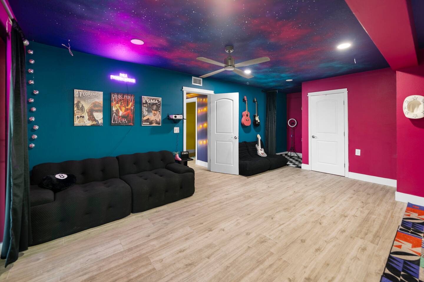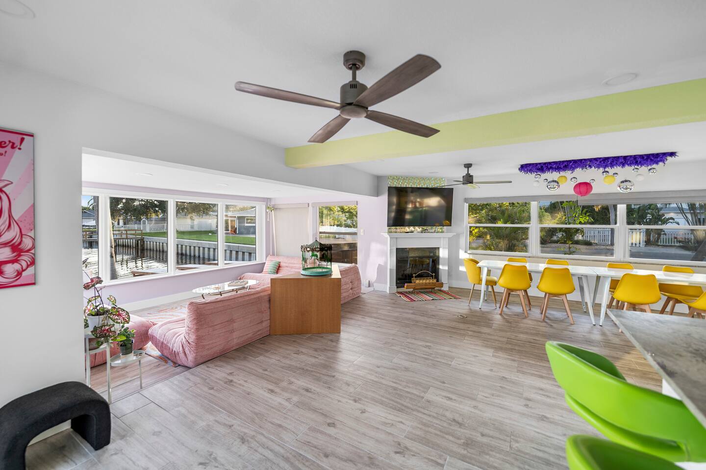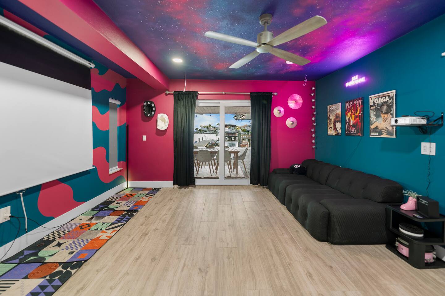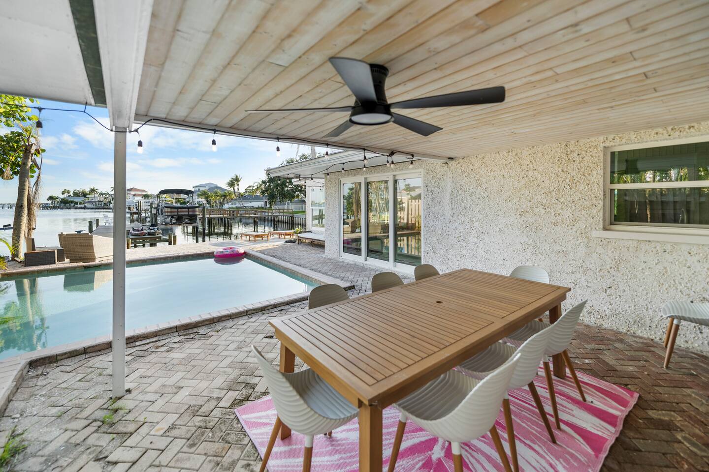 Pink Pony Villa is a private waterfront home designed for groups who want space to gather, celebrate, and enjoy being together — without sacrificing comfort. Outdoor highlights: - Private pool and hot tub* - Waterfront access with kayaks - Fishing poles for guest use - Outdoor dining area and poolside seating - Coolers provided for drinks and snacks Inside the home: - Multiple bedrooms with comfortable beds and fresh linens - Full bathrooms stocked with linens - A fully equipped kitchen for group meals and casual bites - A stocked coffee bar - Open living and dining areas made for hanging out - Smart TVs throughout - Games for group entertainment - A dedicated projector room for movie or karaoke nights - A selfie booth and a recording-studio-style closet, ideal for photos and creative fun Whether you’re spending the day on the water or enjoying time together inside, Pink Pony Villa is set up to match your pace — relaxed, upbeat, and full of good energy. *Hot tub available at an additional fee.