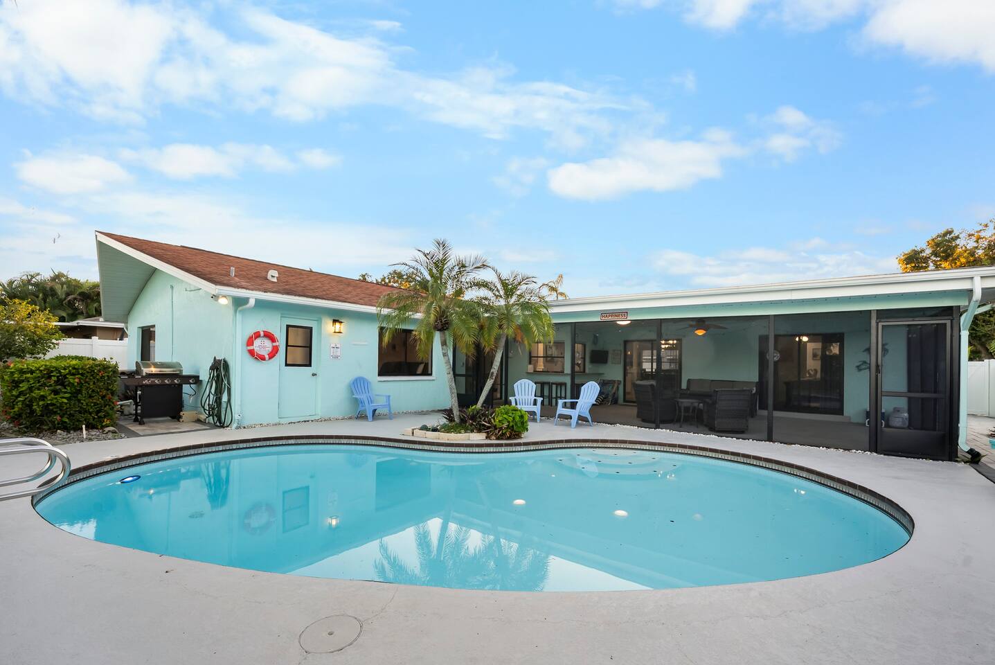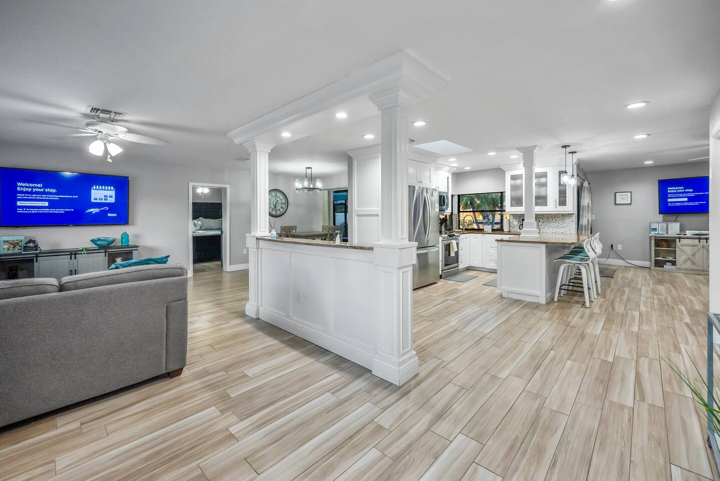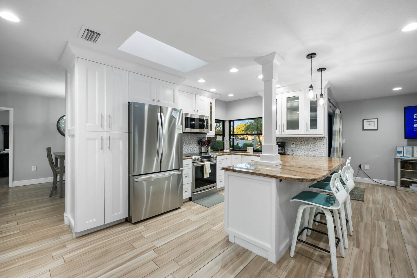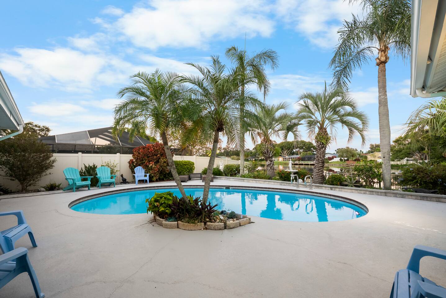 Discover your perfect Florida getaway at this beautiful waterfront retreat in sunny Seminole, where relaxation meets modern coastal living. Designed for comfort and connection, this single-level 4BR, 3BA home blends open spaces, stylish décor, and seamless indoor-outdoor living. Step inside to find an inviting coastal vibe with two spacious living rooms, a fully equipped kitchen with granite countertops and stainless appliances, and Roku smart TVs in every bedroom. Central A/C and fast WiFi keep everyone cool and connected throughout your stay. Outdoors, your private paradise awaits — a sparkling pool, screened-in patio, and tranquil waterfront views surrounded by tropical landscaping. Fire up the propane grill for alfresco dining, unwind with evening cocktails by the water, or soak up the sun on the pool deck. Two spacious suites offer private retreats, including a primary ensuite with a spa-style shower. The thoughtful split floor plan makes it easy for families and groups to spread out and relax after a day of adventure. You’ll be just 10 minutes from Indian Rocks Beach, close to local favorites like the Pinellas Trail, Florida Botanical Gardens, and some of Tampa Bay’s best dining and attractions. With plenty of parking (including room for a boat) and a peaceful neighborhood setting, this home is the perfect blend of comfort, convenience, and coastal charm. Things to Know: Laundry Access Notice: The washer and dryer are located in the garage, which is a separate area from the main living space and secured with a smart lock. Guests may request access to the laundry during their stay. Please note that the garage contains exterior security cameras to monitor stored personal items only. There are no cameras inside the living areas of the home. Up to two dogs are welcome (no other pets without prior approval). Please note: Pool is not heated and water temperature may vary seasonally. The home is located in a quiet, residential area — please respect neighborhood noise guidelines during your stay. Your unforgettable Gulf Coast escape starts here — book your stay and experience Seminole at its best.